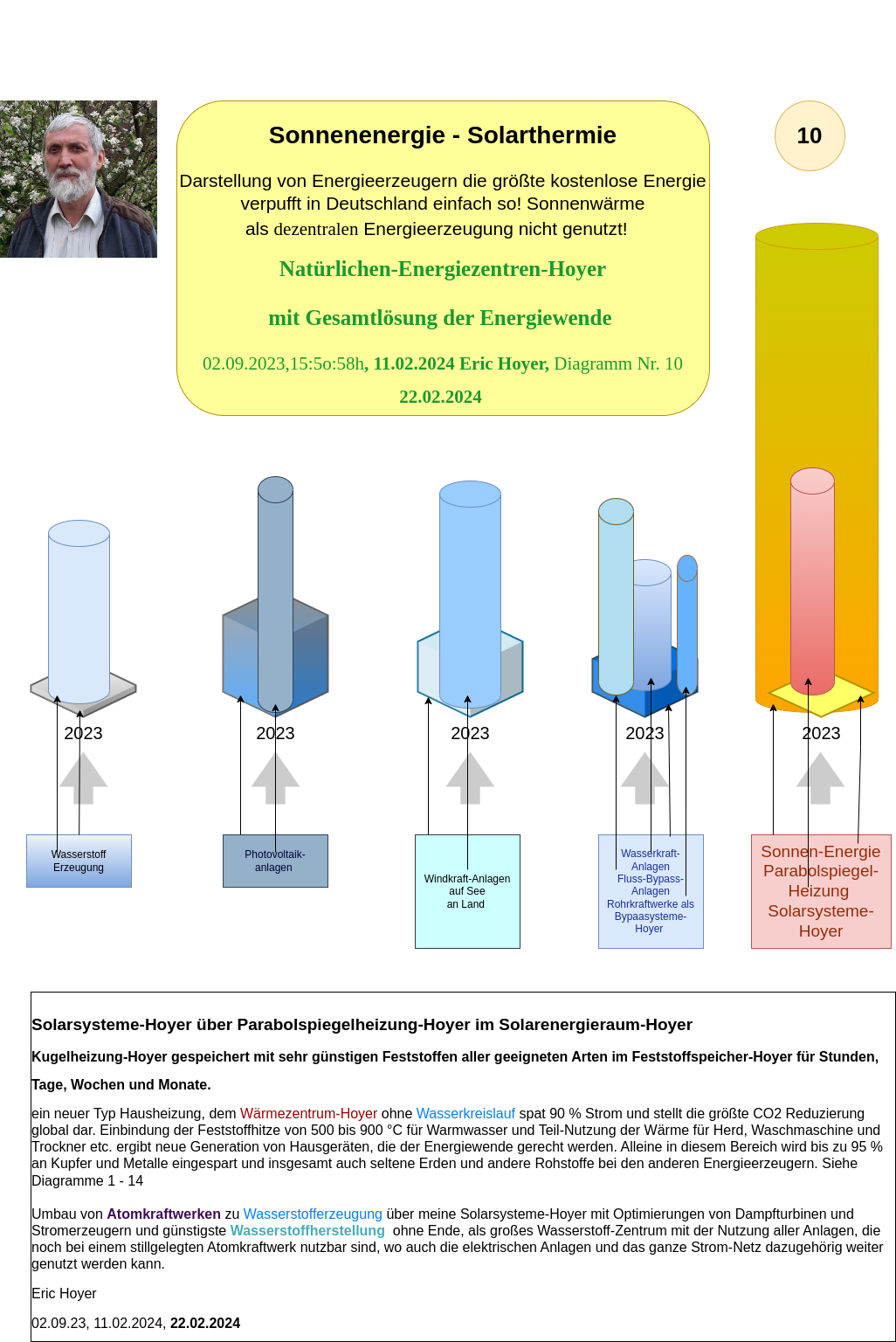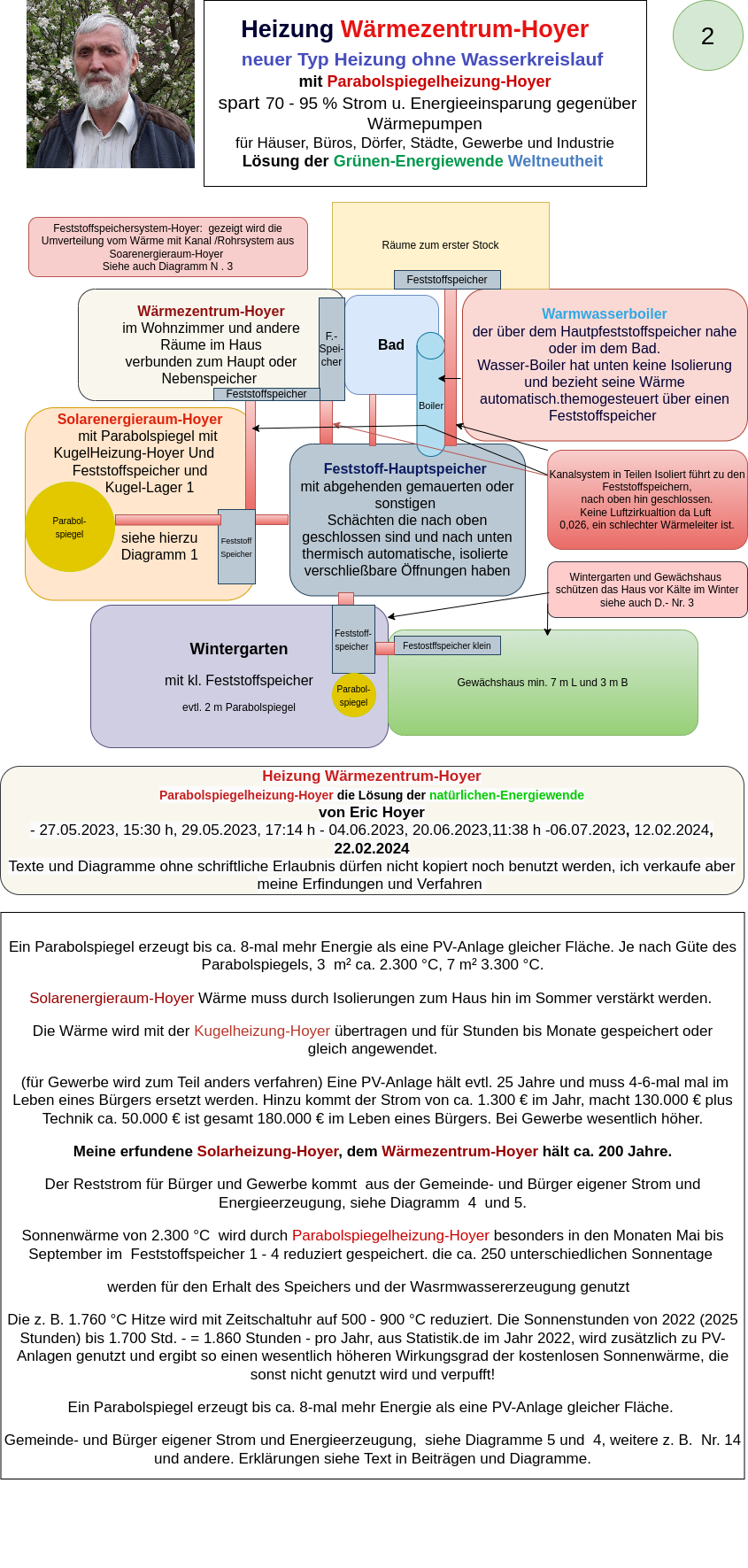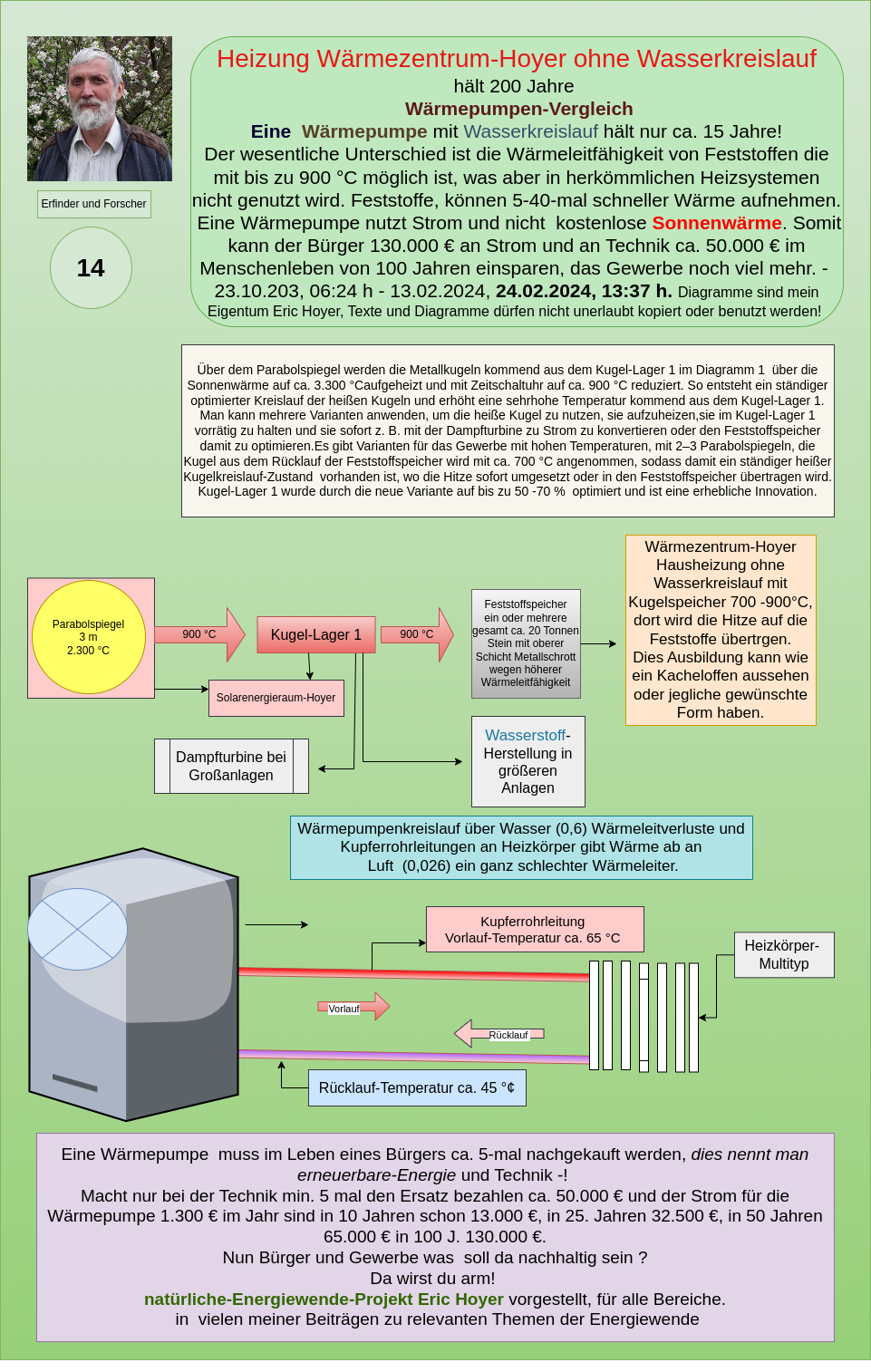 Я, Эрик Хойер, разработал полноценную техническую систему, которая позволяет осуществить глобальный энергетический переход за счёт использования солнечного тепла. В центре стоит прямое, децентрализованное и с минимальными потерями использование солнечной энергии – с помощью методов, которые технически зрелы, экономически эффективны и применимы по всему миру.