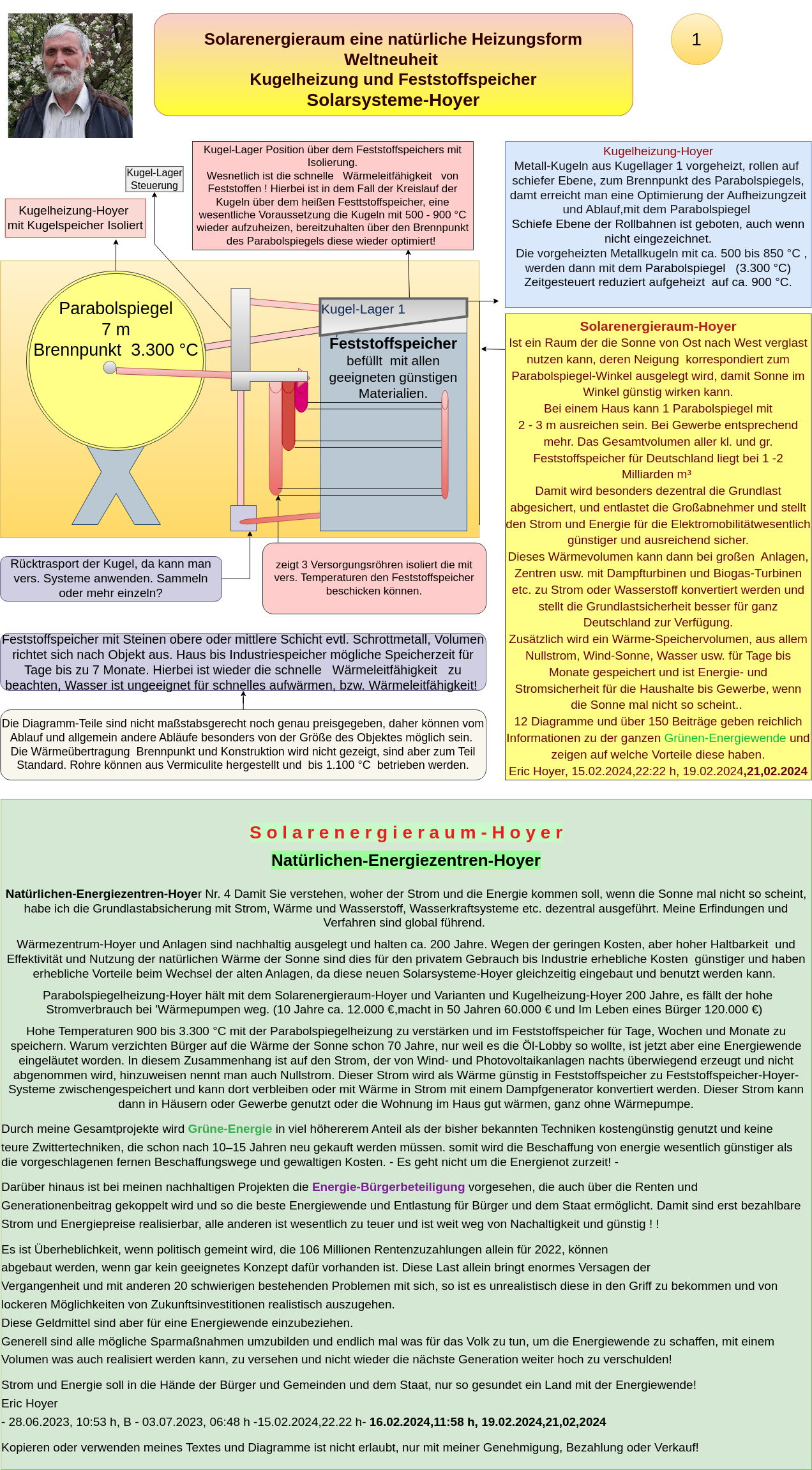 Med Parabolspiegelheizung-Hoyer (parabolisk spegelvärmare enligt Hoyer), i kombination med intelligent Feststoffspeichertechnik (värmelagring i fasta material), kan solvärme fångas upp, lagras och användas vid senare tillfällen – för hushåll, industri, städer och landsbygd.